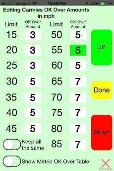 Here is the page where you can set your 'OK over' values for each speed limit. You can set them all to 0 if you never want to be above the speed limit, or to any number you feel comfortable with.