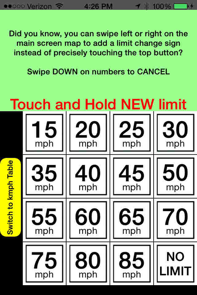 This is the selection screen that appears when you Swipe Left or Right on the map. The only thing left to do is to tell SpeedMinder what the limit of the new sign is and save it.